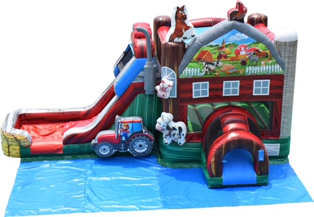 Old McDonald wanted to have some fun so he rented this farm from us. This unit will make you yell "E I E I O!" as you leave out of the barn down its two 12 ft slides. The combo is 15 x 32 ft and 14 feet high. Yee Hah!