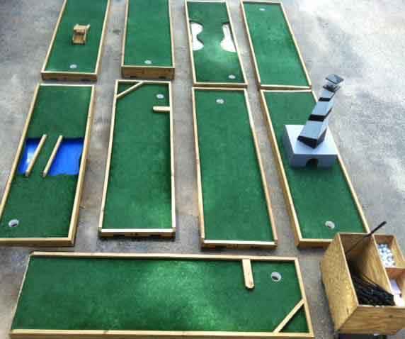 This includes 9 holes of mini golf (10-18). it also includes a cart with putters and a large number of golf balls. Each hole is 3 feet x 10 feet..