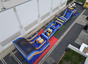 Morton Amusement Inflatables Three story Blue Marble Ninja Wall in Rock Hill, Catawba, Tega Cay, McConnells, York, Clover, Chester, Lancaster, Fort Mill and Indian Land in South Carolina. This three-story high center climbing wall features two high-speed slides and bold blue marble graphics. Built as a Large Deluxe Unit, it pairs perfectly with the Blue Marble Ninja obstacle to create extended courses that thrill competitors and spectators alike. 🎪