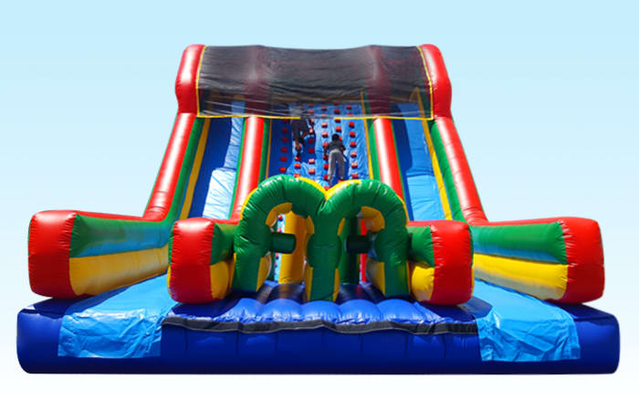 This three story, double lane slide has a center climbing wall and makes a great center piece to any large event. This unit can be attached to a ninja run if you rent that unit also and make an obstacle course that is double lane and 120 feet long.