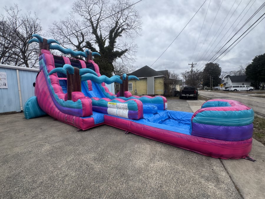 Morton Amusement Inflatables Pink Lightning double lane water slide in Rock Hill, York, Fort Mill, Lancaster, Chester, Tega Cay, Lake Wylie and Richburg is an 18-foot high thrill machine. It delivers fast, safe, side-by-side racing into a splash pool. Perfect for backyard parties, school events, and summer camps. Bright pink styling grabs attention. Two lanes double the fun. 😍