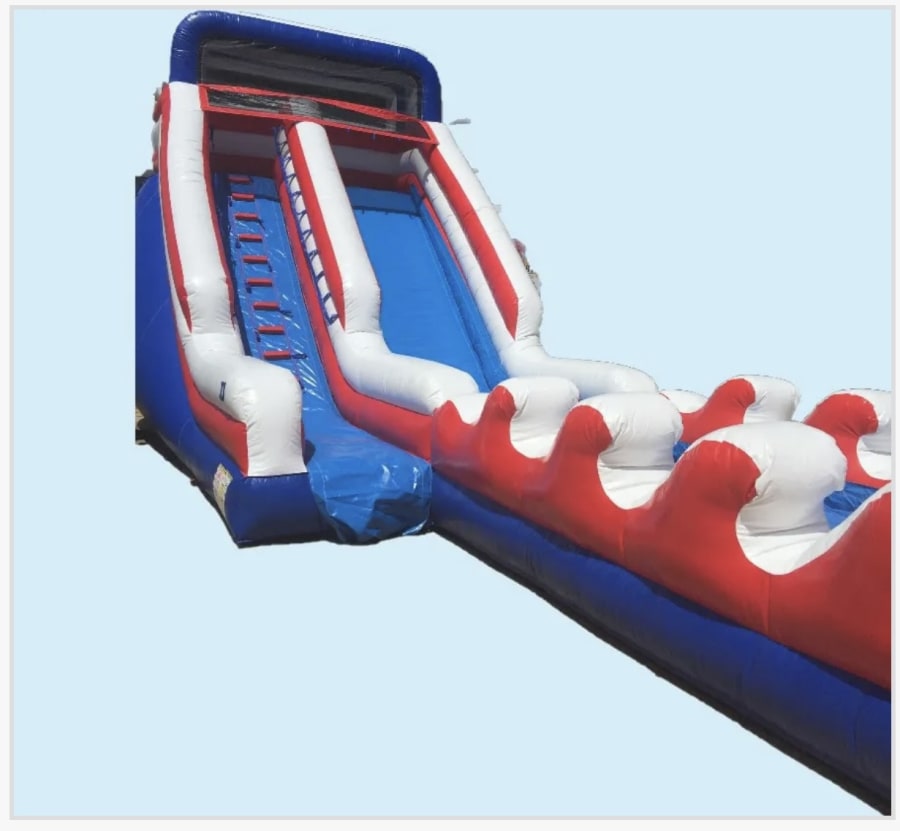 Our Ocean Water slides are some of our most popular units and fantastic for large events. Small children to adults will have a blast on these as they are sprayed coming down the 20 ft slide and then surge through the water as they continue down the elevated 25 ft slip and slide. Exit to the right and you’re back in line again. Oceans come in a variety of colors and are 16 x 37 feet long. These are perfect for VBS’s and Summer camp water days.