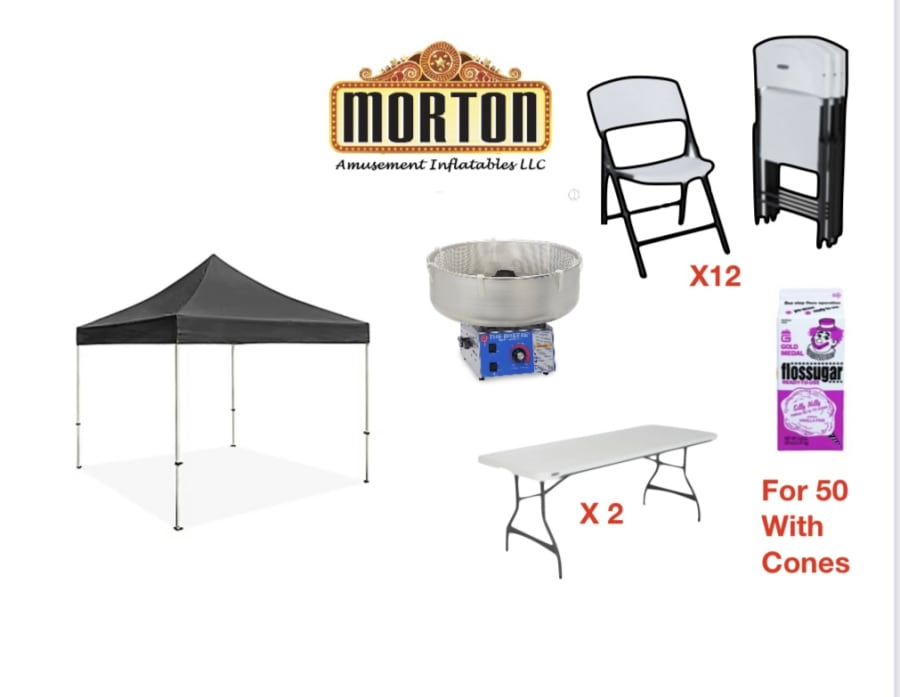 Cotton Candy Machine, 10 x 10 tent, 12 chairs , two 6 ft tables and Blue (Blue Raspberry) product for 50 with cones.